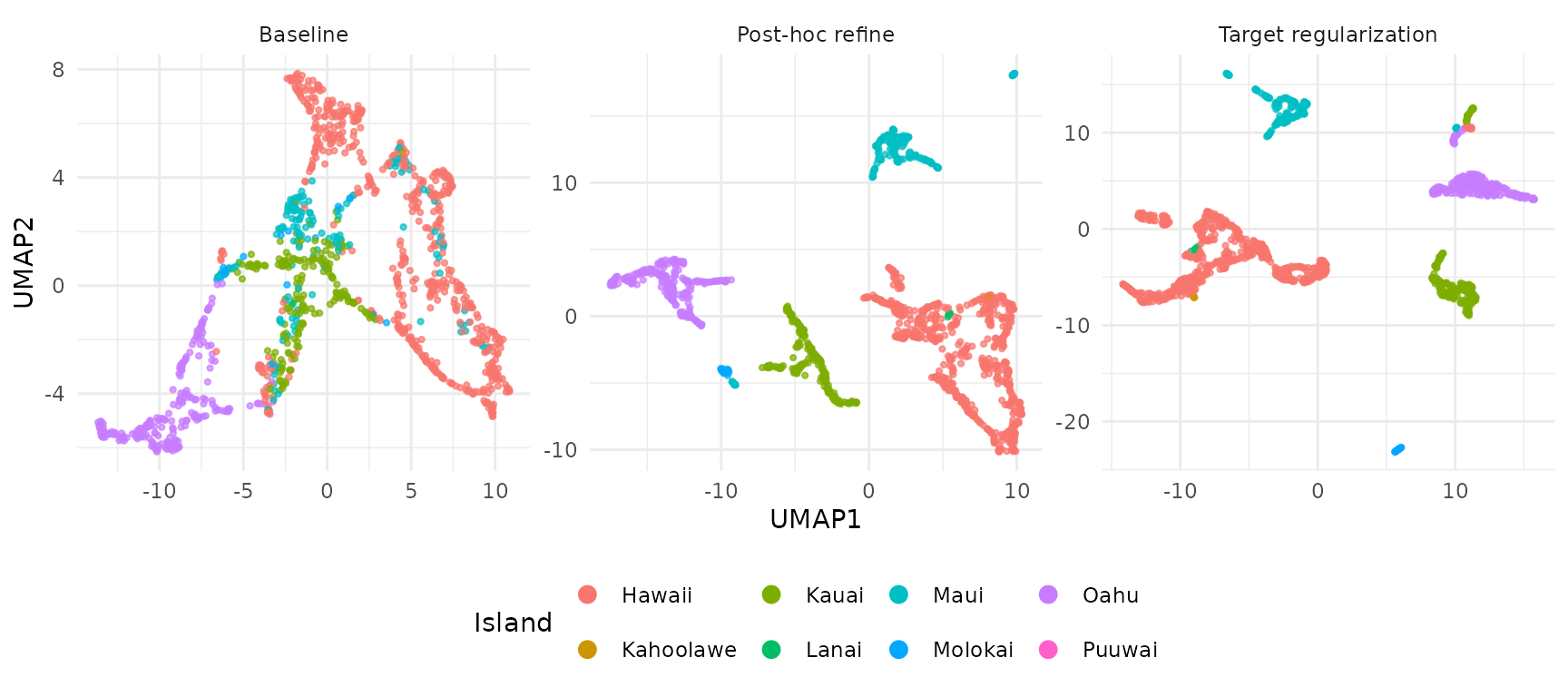 UMAPs of the H embeddings show how each method affects island separation: