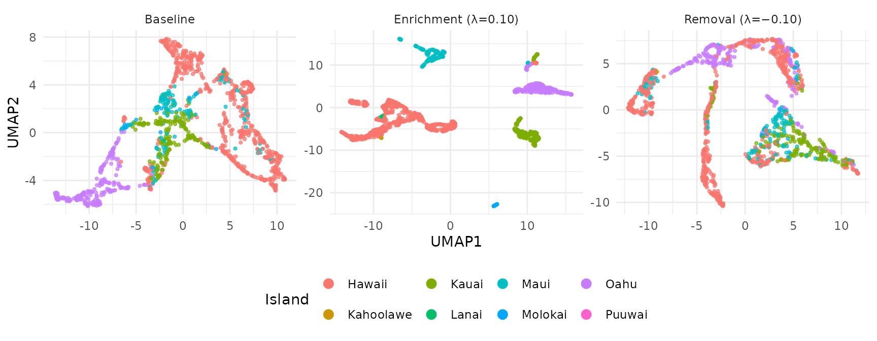 Enrichment sharpens island clusters; removal mixes them together. The remaining structure in the removal UMAP reflects ecological signal that is not explained by island identity (e.g., elevation, habitat type, or shared species assemblages).