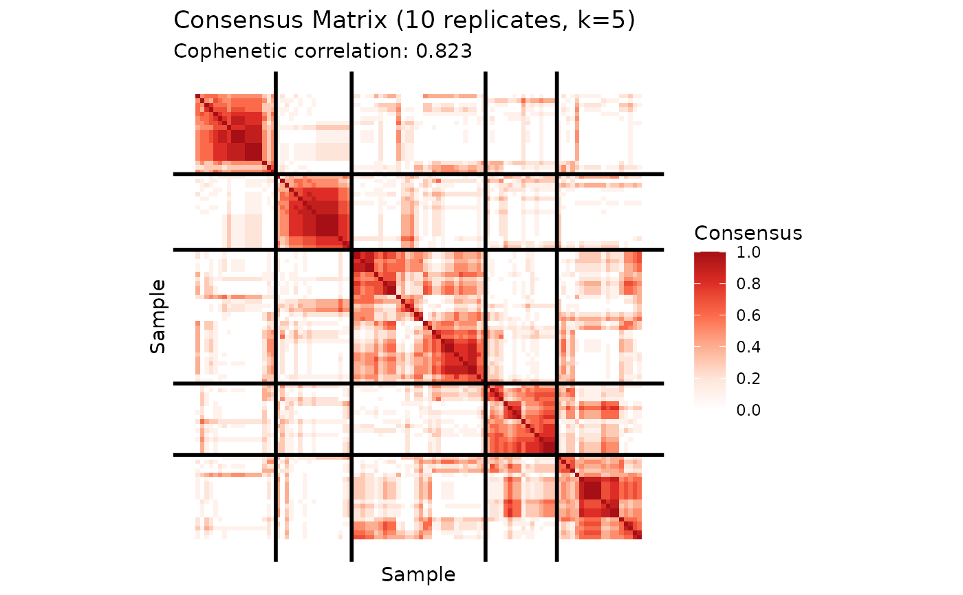 consensus- consensus matrix (samples x samples)models- list of fitted nmf objectsclusters- final cluster assignmentscophenetic- cophenetic correlation coefficientmethod- consensus method used