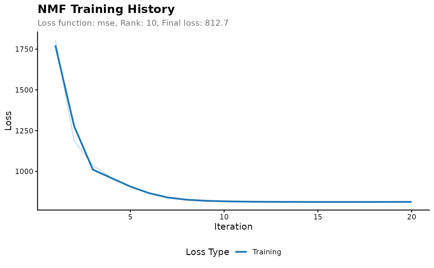 TensorBoard-style visualization of NMF training dynamics, convergence analysis, and factor diagnostics. Provides multiple plot types for comprehensive model analysis.